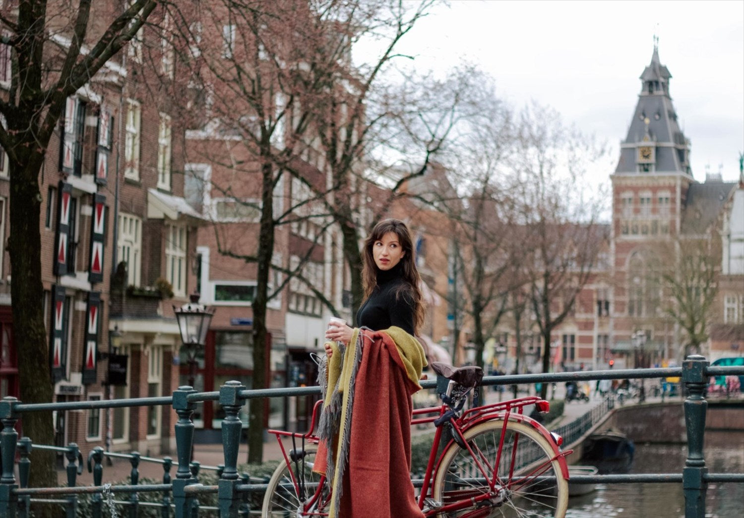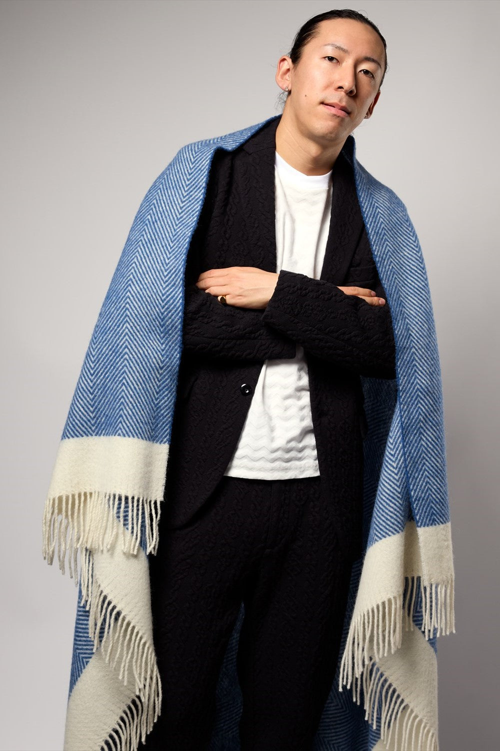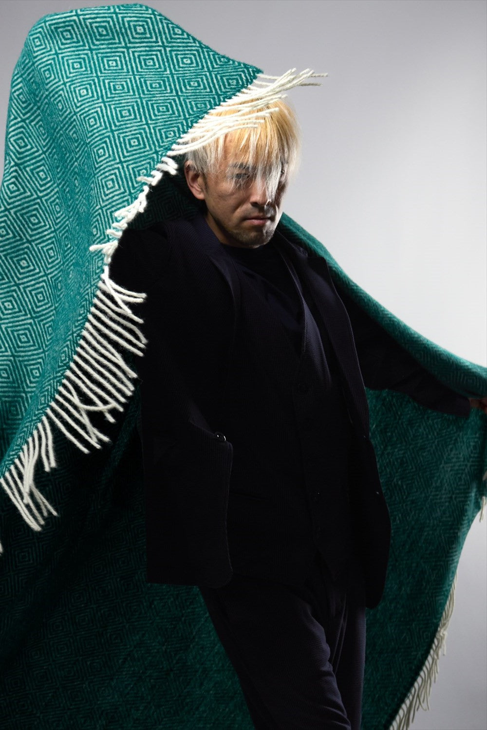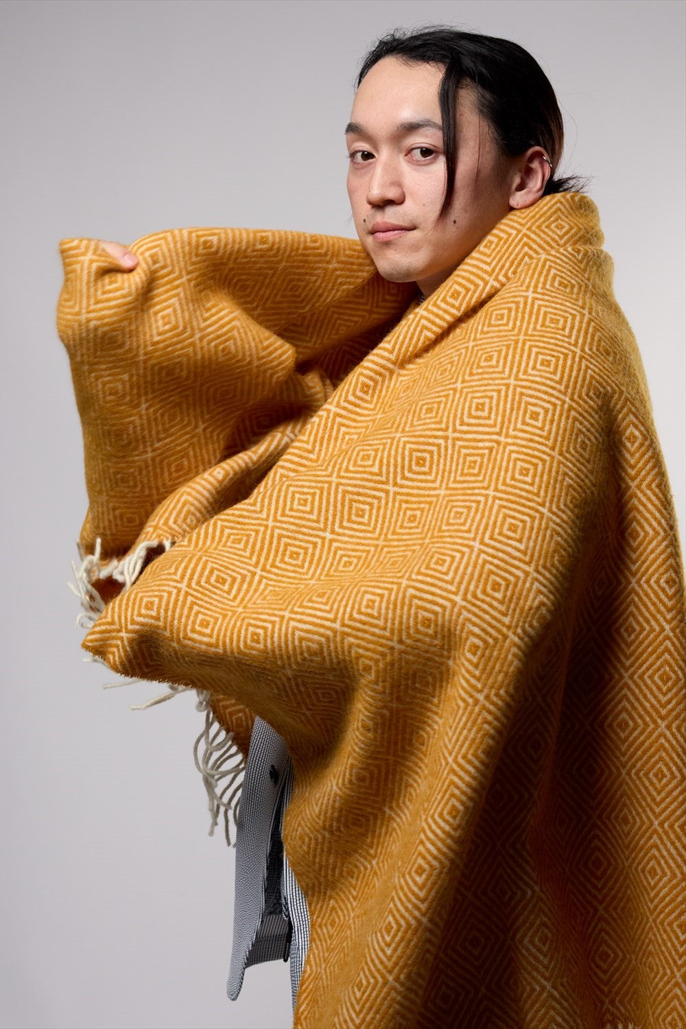 また、身体がすっぽり包まれるサイズのためポンチョやケープコートのように羽織ることでウール独特の風合いと色合いがアクセントとなります。